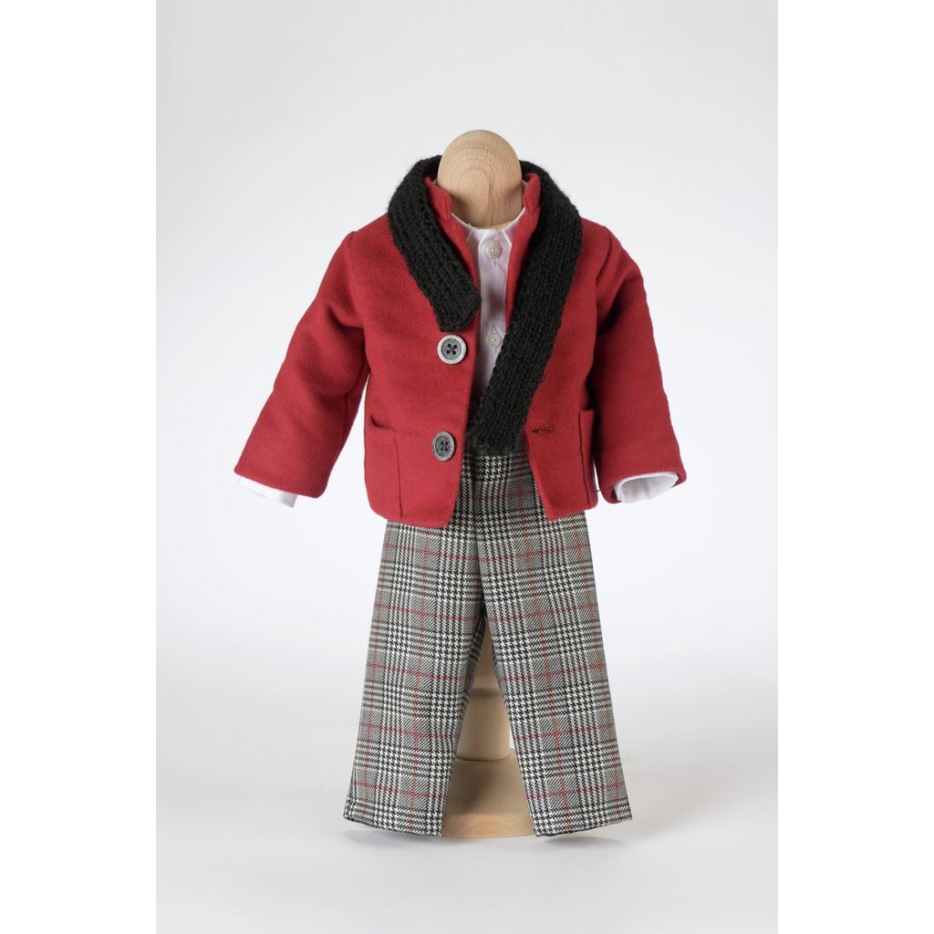 Diese schicke Bekleidung besteht aus einer karierten Hose, einem weißen Hemd, einer roten Jacke und einem Strickschal. Sie passt gestopften und formgeschäumten Käthe Kruse Puppen der Größe 47 cm.