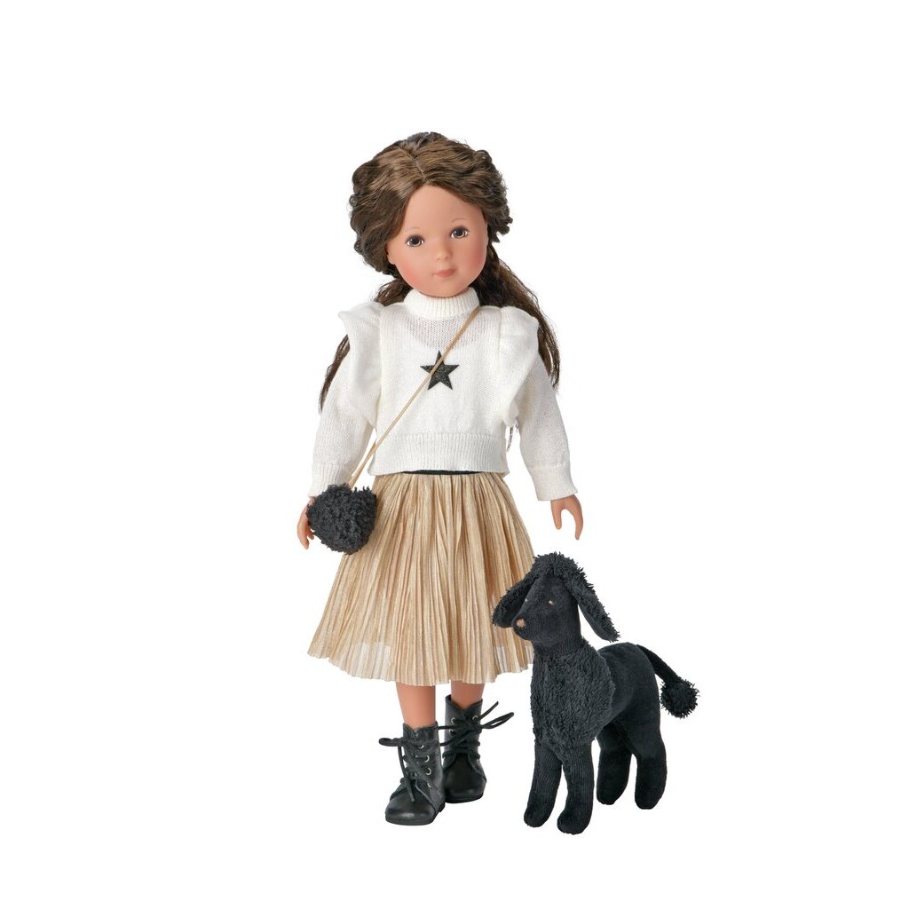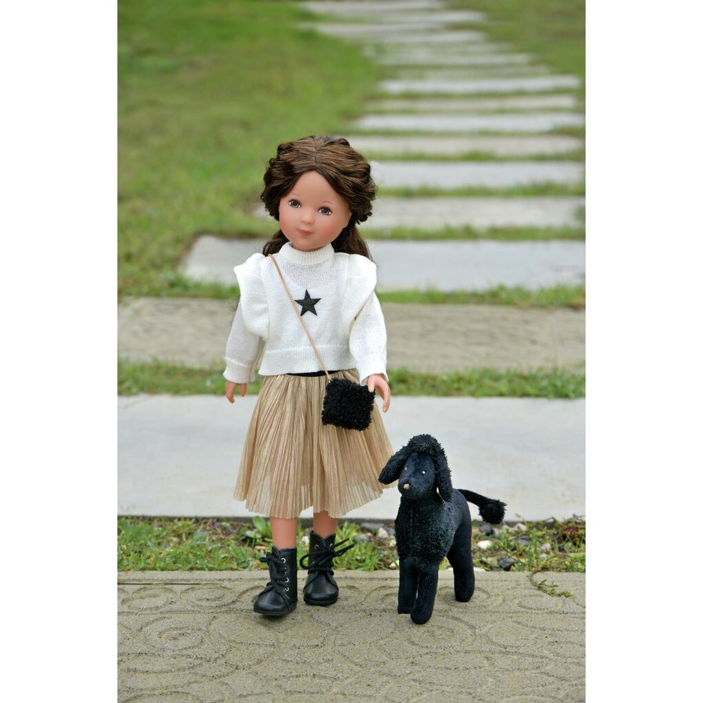 Kayla ist ein echtes Fashion Girl. Zum leichten Plissee-Rock kombiniert sie einen stylishen Strickpullover und derbe Boots. Ein echter Hingucker ist die Felltasche am Goldkettchen. Egal ob beim Spaziergang durch den Park oder beim Treffen mit Freunden, Kaylas Königspudel ist als treuer Begleiter stets dabei.