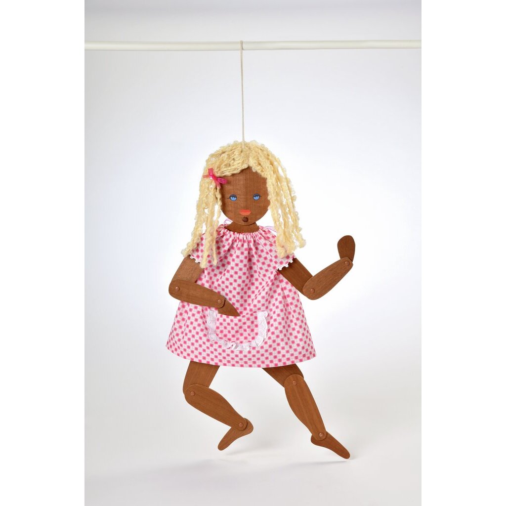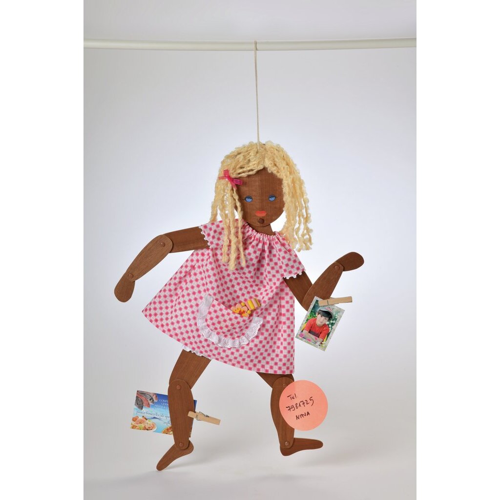 1963 brachte Hanne Adler-Kruse das Modell Graziealla auf den Markt. Dieses bewegliche Puppenbild sollte als Malvorlage dienen und zum Basteln von Kleidern anregen. Lotti haben wir als Memoboard-Puppe für Küche oder Home Office gefertigt. In der Schürze findet ein Stift Platz, Notizen und schöne Fotos können per Klammer oder Magnet an der Puppe befestigt werden. Graziella Lotti ist aus flachem Holz gefertigt und die Gliedmaßen lassen sich beliebig bewegen. Das Gesicht ist handgemalt. Die Haare sind aus Wolle.