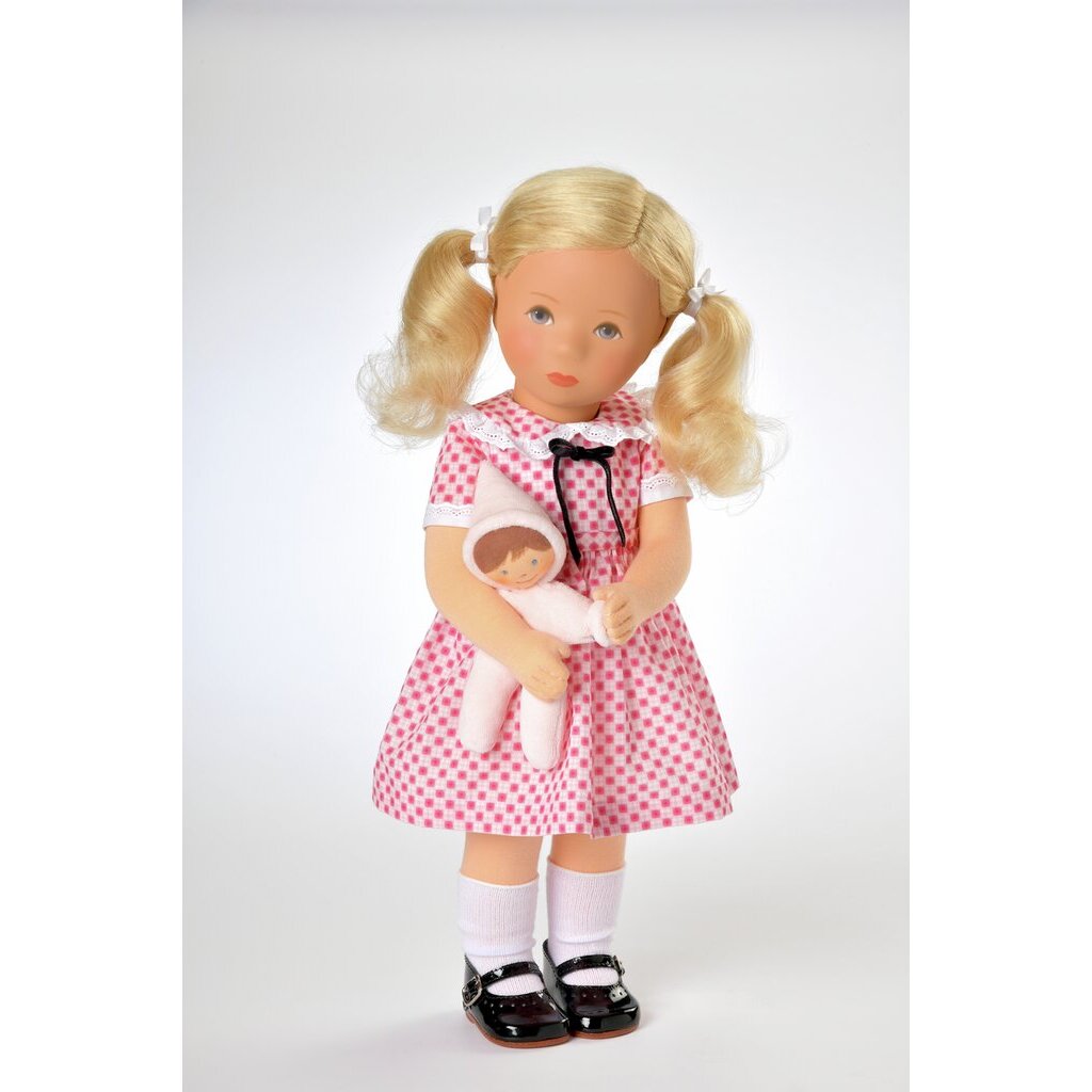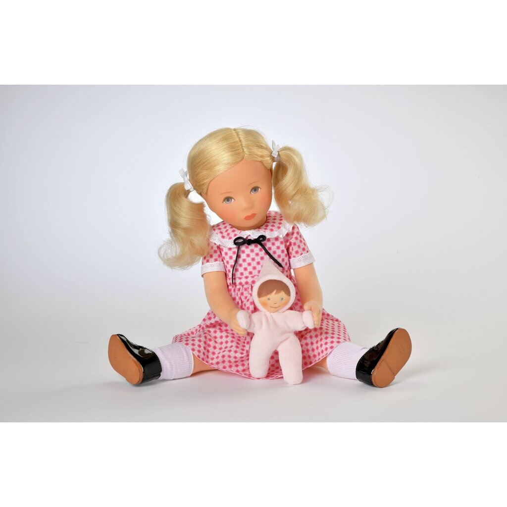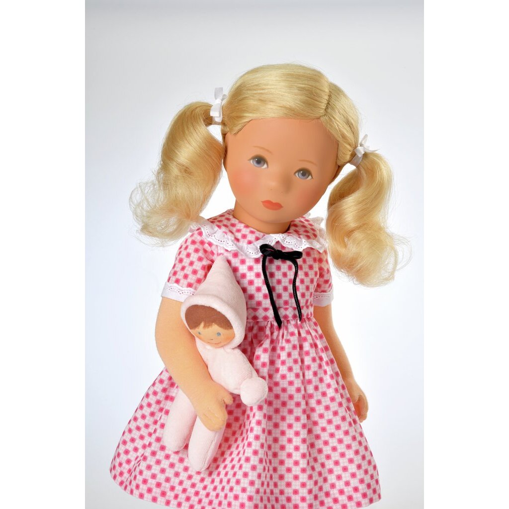 Flessibila ist eine Käthe Kruse Puppe Modell Hanne Kruse. Käthe Kruses Tochter entwickelte sie 1963 als innovative, edukative und kindgerechte Spielpuppe. Mit diesem Modell zeigte Hanne Kruse, dass die Traditionsmanufaktur sich stets mit dem Zeitgeist entwickelte. Nanna ist mit dem charakteristischen mininimalistisch gehaltenen Kopf der 1970er Jahre eine Hommage an Hanne Kruses Puppenmodell.Der Körper ist 47 cm groß und formgeschäumt. Das blonde Echthaar trägt Nanna zu seitlichen Pferdeschwänzen frisiert. Das Gesicht mit den blauen Augen ist handgemalt. Nanna trägt ein hübsches Kleid im Retrostil, das an Flessibila Nanna aus dem Jahr 1963 erinnert. Dazu trägt sie schwarze Lackschuhe. Ihren kleine Stoffpuppe hat Nanna immer dabei. Auch diese ist eine Hommage an Hanne Kruses Stoffpüppchen.