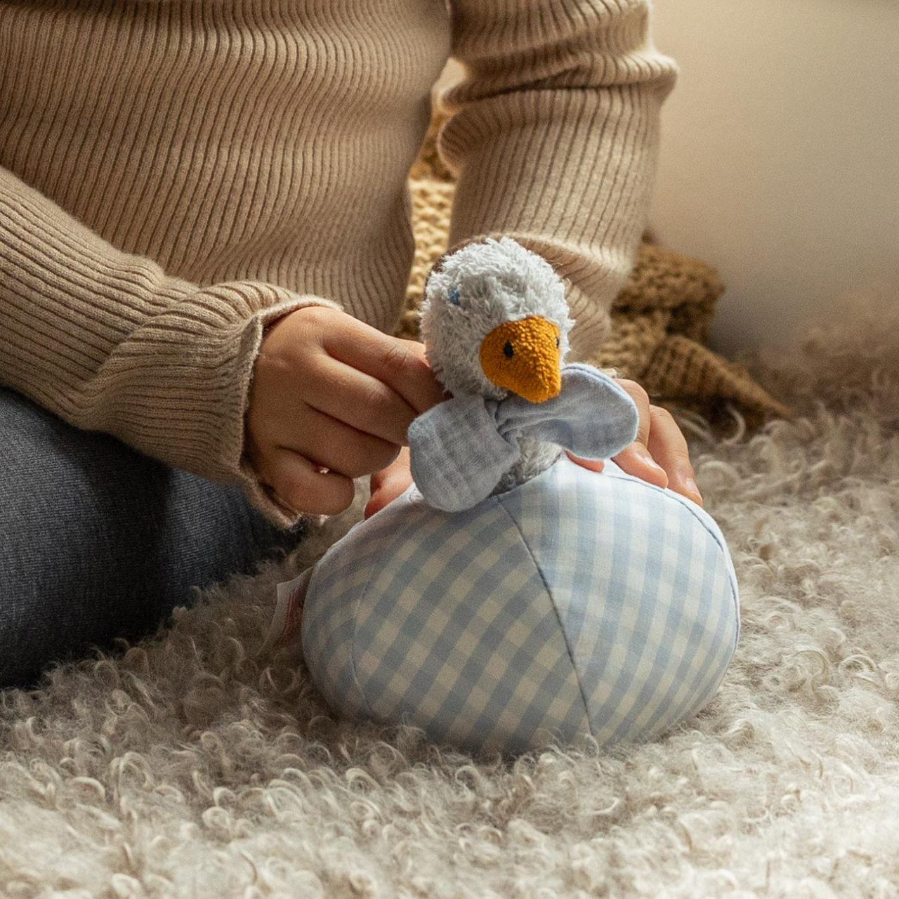 Wer hat Ebba gesehen? Die kleine Ente versteckt sich in einem weichen Ball aus karierter Baumwolle und dient als Greifling. Kleine Finger können sie aus dem Ball herausziehen oder wieder darin verschwinden lassen – perfekt für erste Steckspiele. Ebba ist aus Baumwollfrottee und verfügt über eine wunderschöne Musselinschleife, die das Zupacken durch kleine Hände erleichtert. Wird Ebba hochgenommen und bewegt, überrascht sie mit einem sanften Rasseln.