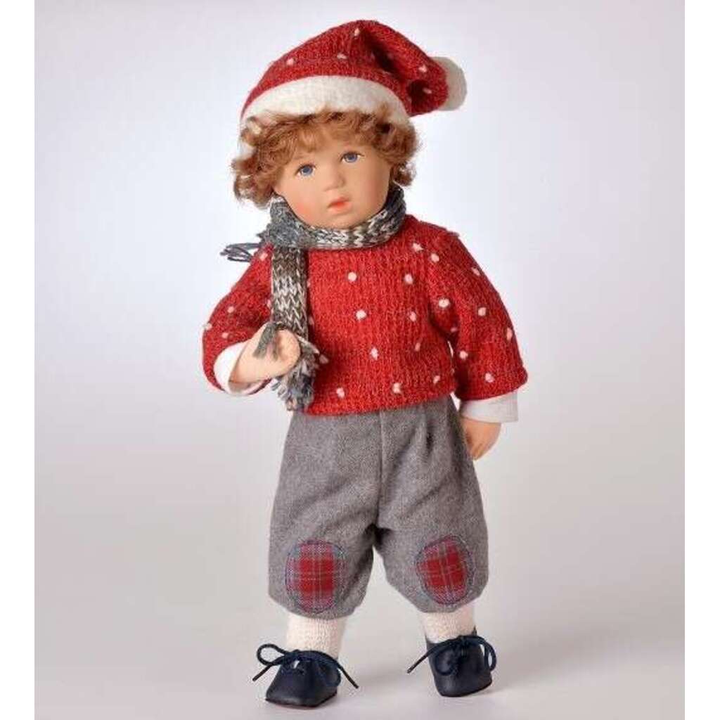 Unsere Sammlerpuppen und Bekleidung werden handgefertigt und haben eine Lieferzeit von ca. 30 Werktagen. Jonah ist eine 34 cm große Schummelchen Puppe. Der Körper ist weich geschäumt und hat im Inneren ein bewegliches Drahtskelett. Der Kopf ist aus Polysterol gefertigt und liebevoll von Hand bemalt. Jonahs Augen sind strahlend blau. Die mittelbraune Echthaarperücke trägt Jonah zu einem frechen kurzen Lockenkopf frisiert. Jonah ist winterlich bekleidet und trägt eine graue Flanellhose. Der rote Strickpullover und die passende Zipfelmütze sind mit lustigen weißen Tupfen verziert. Blaue Lederschuhe und ein Strickschal komplettieren das hübsche Winteroutfit.