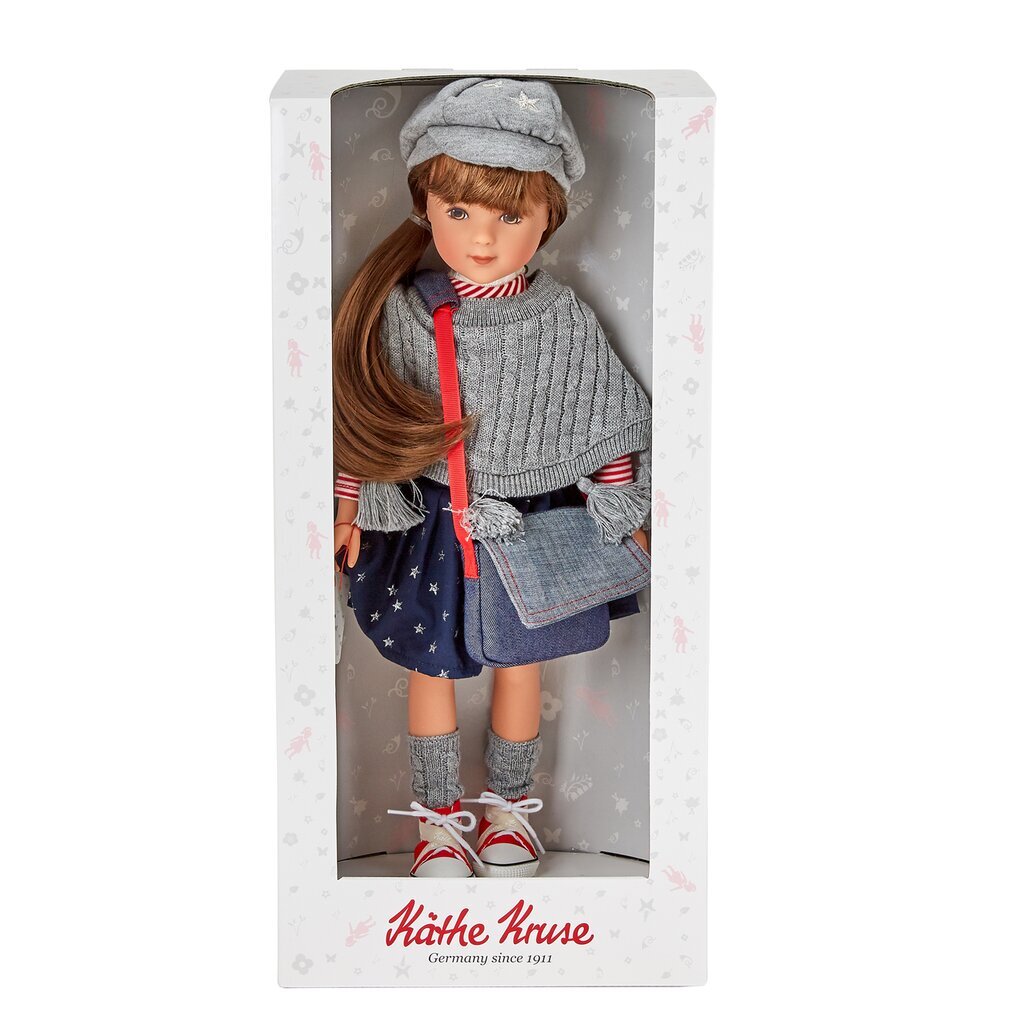 La Bella Aimee ist eine 42 cm große Stehpuppe aus hochwertigem Vinyl. Sie hat handbemalte braune Augen und lange, glänzend braune Haare mit Pony aus Kanekalon. Sie trägt ein modisches Kleid bestehend aus einem Oberteil in rot gestreiften Singlejersey mit angesetztem Faltenrock in marine mit Sternendruck. Darüber hat sie einen gestrickten grauen Poncho, dazu passende Strickstulpen und eine Schildmütze. Ihre Collegetasche und die roten Chucks machen das Outfit komplett.