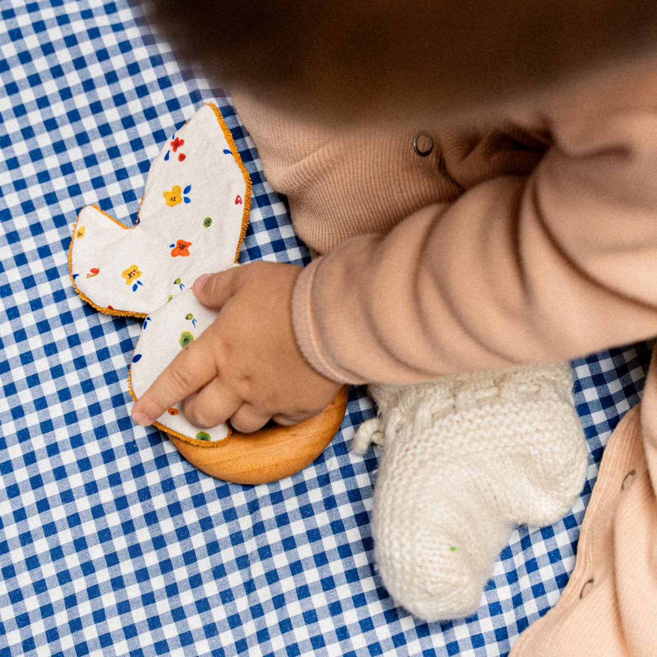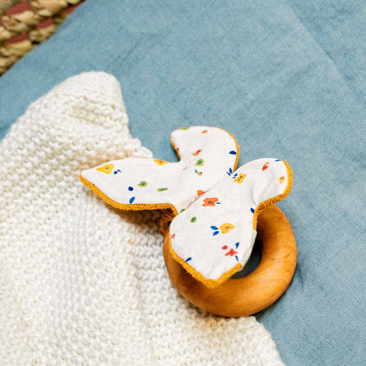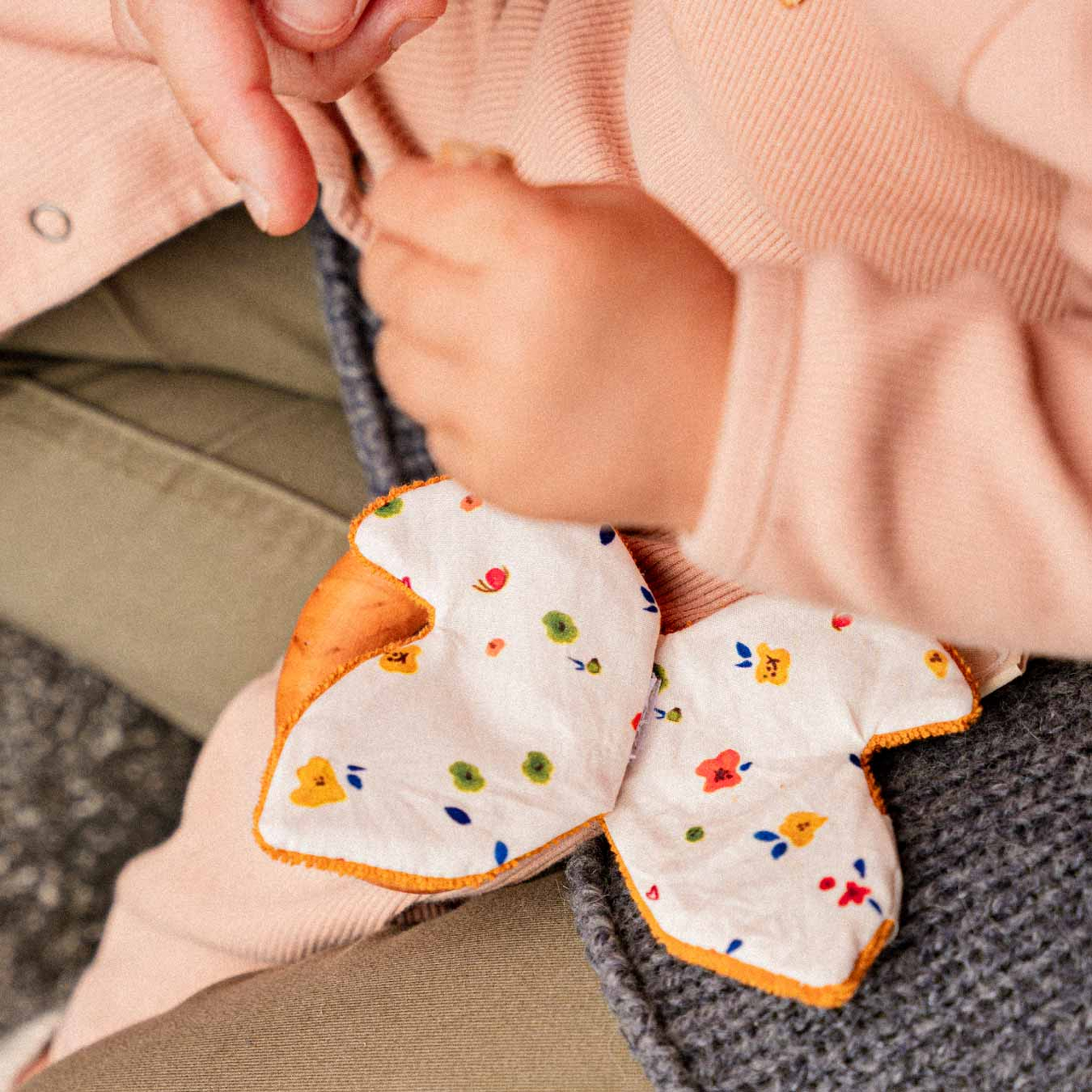 Was raschelt denn da? Das ist der wunderschöne Papillon Greifling aus Kirschbaumholz mit einem niedlichen Schmetterling aus Strickfrottee und Baumwollstoff. Kinder entdecken die Welt mit ihren Händen und ihrem Mund. Durch die Füllung aus Knisterfolie lädt dieses Greif-Spielzeug kleine Händchen zum Entdecken und kleine Ohren zum Lauschen ein. Durch den hochwertigen Stoff muss sich zudem keine Gedanken darum gemacht werden, wenn das Kind etwas in den Mund nimmt.