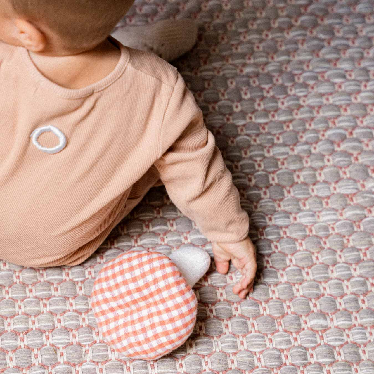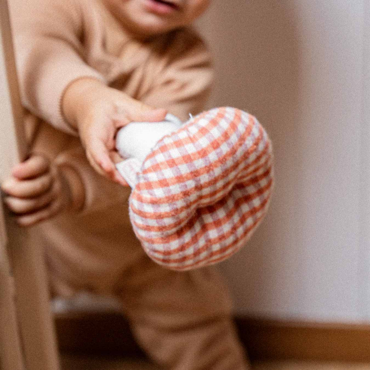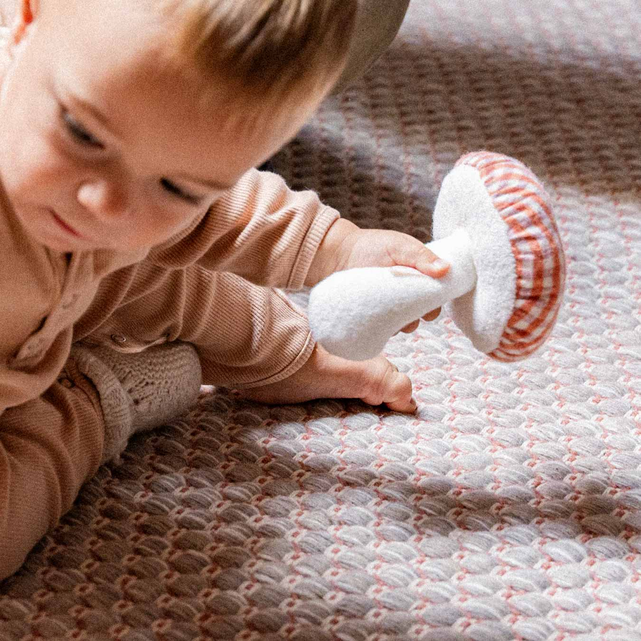 Auf geht’s, in den Wald! Der kleine Pilz aus kariertem Baumwollstoff und aufgerautem Baumwollflanell sieht nicht nur besonders niedlich aus, sondern lässt sich auch gut von kleinen Fingern greifen. Außerdem regt eine kleine Glocke im Inneren die Hörfähigkeiten an. Kinder entdecken die Welt zuerst mit ihrem Mund, dann mit den Fingern und den Ohren. Durch die hochwertigen Stoffe muss sich keine Sorgen gemacht werden, wenn der Pilz einmal in den Mund genommen wird.