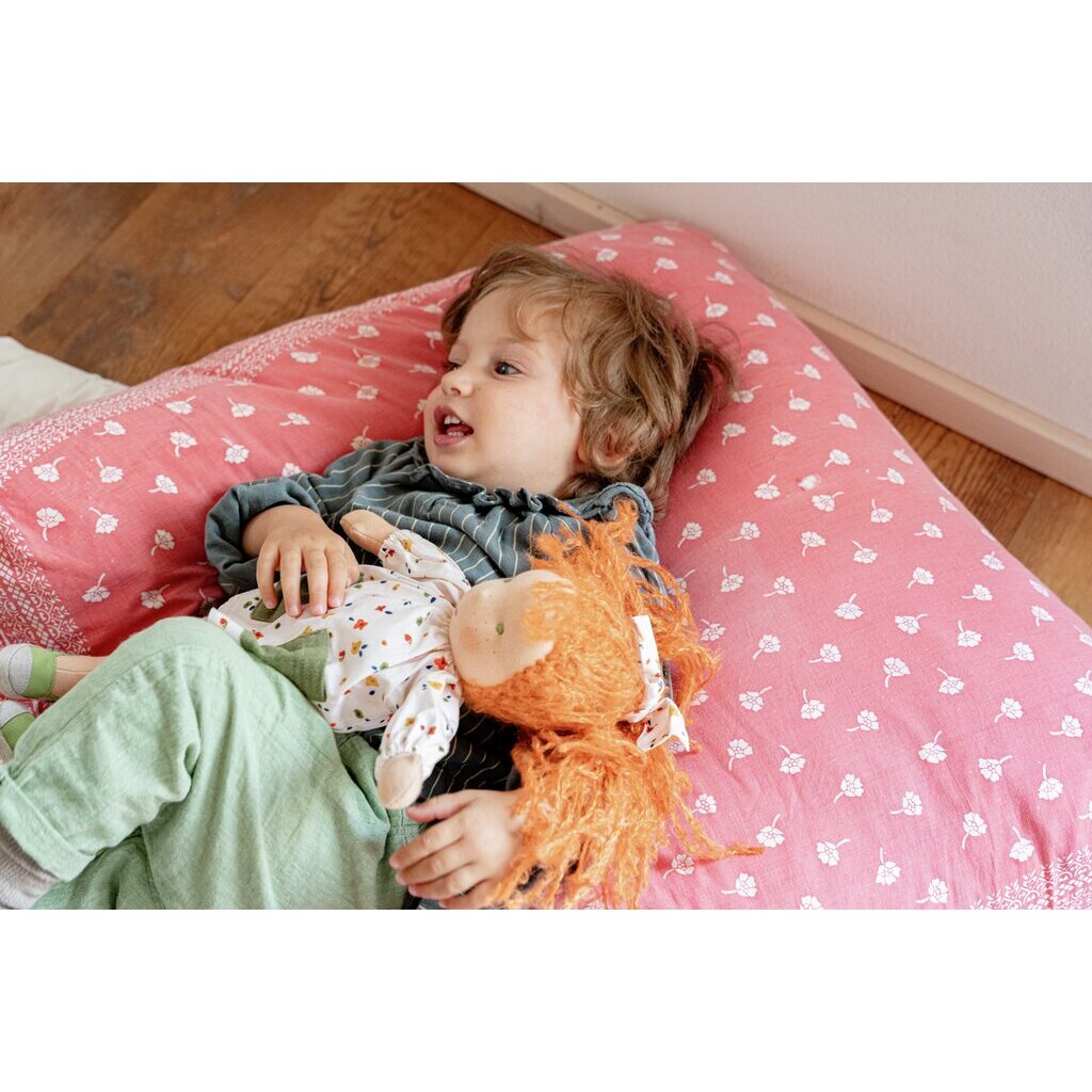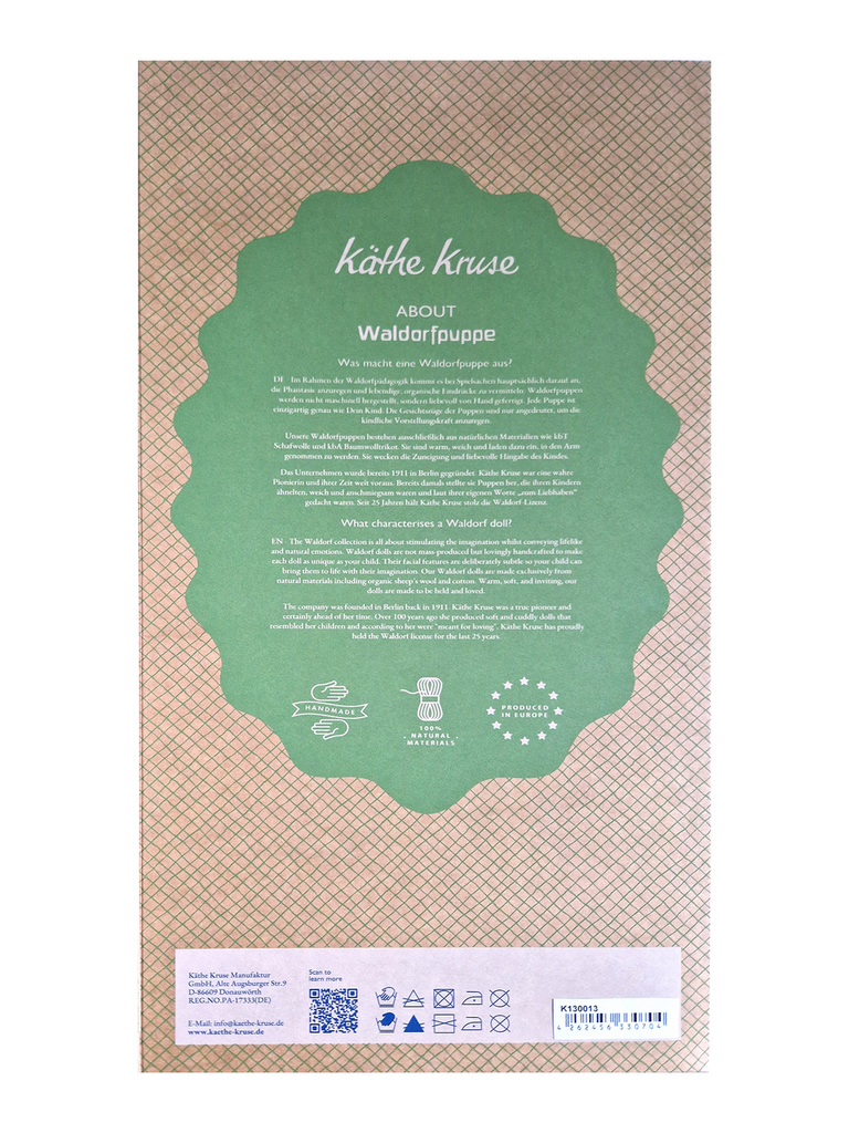 Waldorfpuppe Elsa liebt die Natur. Sie ist bei jedem Wetter draußen und liebt alle Elemente sowie alle Tiere. Bei Regen spielt sie am liebsten mit den Schnecken und badet sie in Pfützen. Eine Spielpuppe kann Kindern als Freund oder als „Ich-Figur“ dienen, mit der sie ihre Erlebnisse nachspielen und dadurch ungewohnte Situationen besser verstehen können. Eine Puppe mit gegebenen Charakteristika hilft oft, sich leichter mit ihr zu identifizieren.