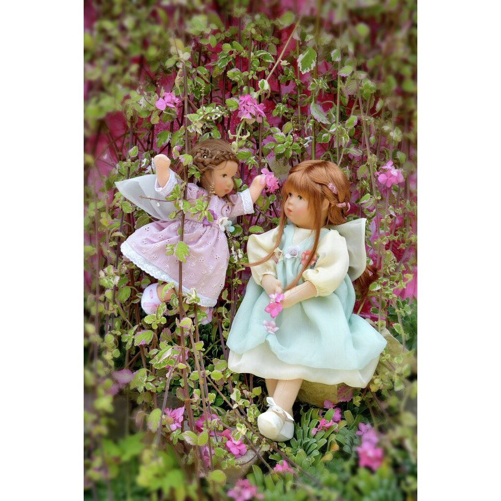 Alette ist eine Käthe Kruse Däumlinchen Puppe. Der Puppenkörper ist 25 cm groß und weich geschäumt. Er ist mit Trikotstoff bezogen und im Inneren befindet sich ein Drahtskelett das die Puppe beweglich macht. Der Kopf ist aus Polysterol gefertigt und künstlerisch von Hand bemalt. Die Augen sind grün. Die braune Echthaarperücke trägt Alette teils geflochten und teils mit offenen Locken frisiert. Bekleidet ist Alette wie eine kleine Fee. Das Kleid ist mit einem hübschen Blütengürtel verziert, die Filzschühchen sind mit einer Schleife gebunden. Ihre Feenflügelchen kann Alette auch abnehmen. Der Name Alette bedeutet "Die Kleine mit den Flügeln". Unsere Sammlerpuppen und Bekleidungen werden handgefertigt und haben eine Lieferzeit von ca. 30 Werktagen.