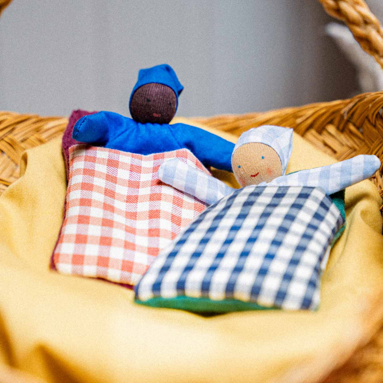 Ich bin an deiner Seite: Das kleine Püppchen liegt am liebsten direkt neben dem Kind, wenn es schläft. Dafür hat es seinen eigenen Schlafsack dabei, der mit einem weiß-blauen Karomuster für Hingucker sorgt. Gefertigt sind Schlafsack und Püppchen aus Baumwollkaro und Baumwollmusselin. Wenn das Püppchen mal nicht schlafen soll, kann es auch frech aus der Jackentasche oder dem Federmäppchen herausschauen.