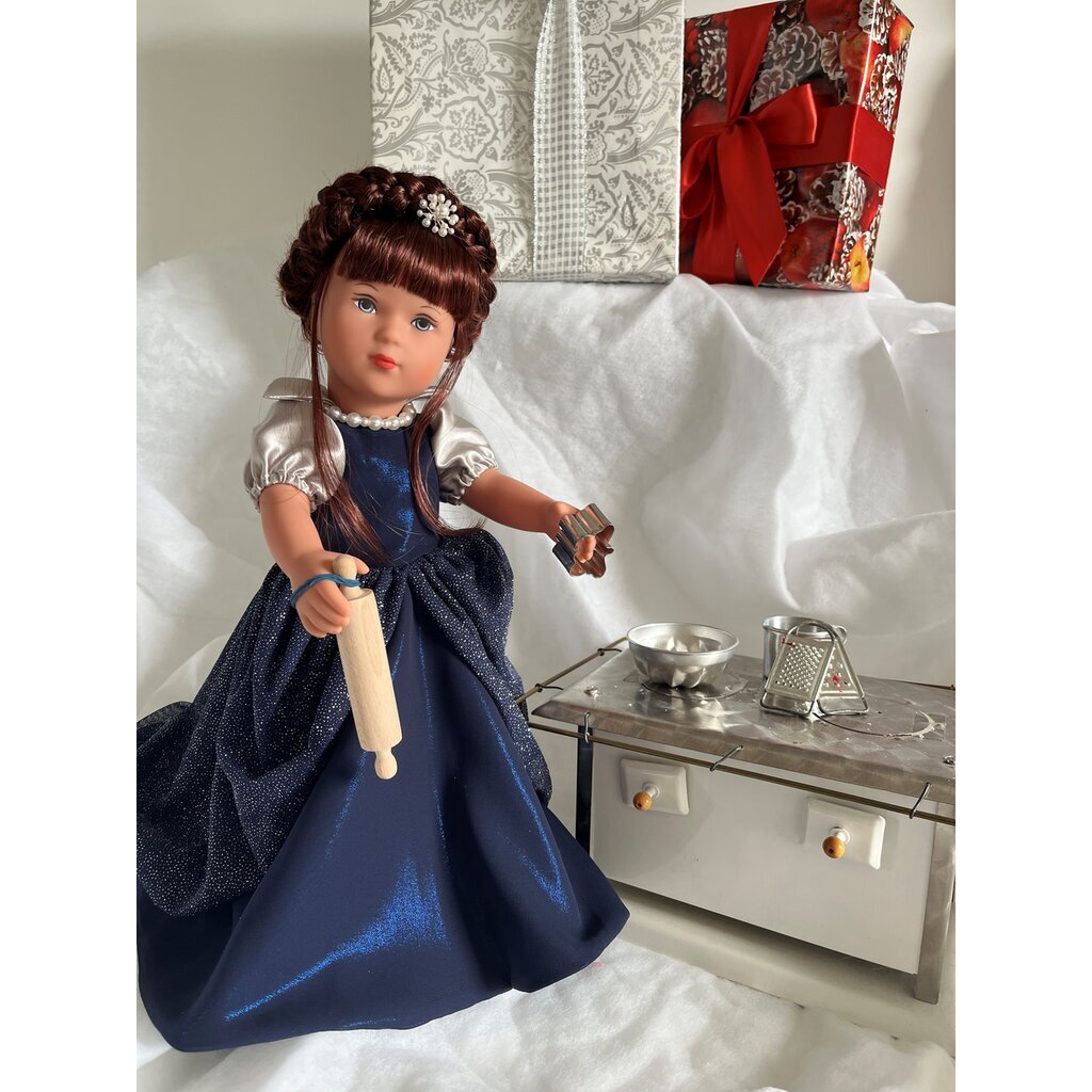 Die Backende Prinzessin ist ein Käthe Kruse Sondermodell in Zusammenarbeit mit der innovativen Buchmarke Kunstimperium. Die Puppe wurde passend zum begleitenden Märchenheft gestaltet. Der Puppenkörper ist 41 cm groß und komplett aus hochwertigem Vinyl gefertigt. Das hübsche Puppengesicht mit den strahlend blauen Augen ist künstlerisch von Hand gemalt. Die hochwertige rotbraune Kunsthaarperücke ist zu einer fantasievollen Flechtfrisur frisiert und mit einer Perlenspange verziert. Das Kleid der backenden Prinzessin ist aus einem schimmernden nachthimmelblauen Stoff genäht und auf der Scherpe tanzen hunderte silberne Tupfen wie Sterne. Um den Hals trägt die Prinzessin eine Perlenkette. Als Backende Prinzessin bringt sie selbstverständlich ihren Teigroller und ein Ausstechförmchen mit. Mit der Puppe geliefert wird ein Märchenheft der Buchmarke Kunstimperium, das die Geschichte der Backenden Prinzessin erzählt. Unsere Sammlerpuppen und Bekleidungen werden handgefertigt und haben eine Lieferzeit von ca. 30 Werktagen.