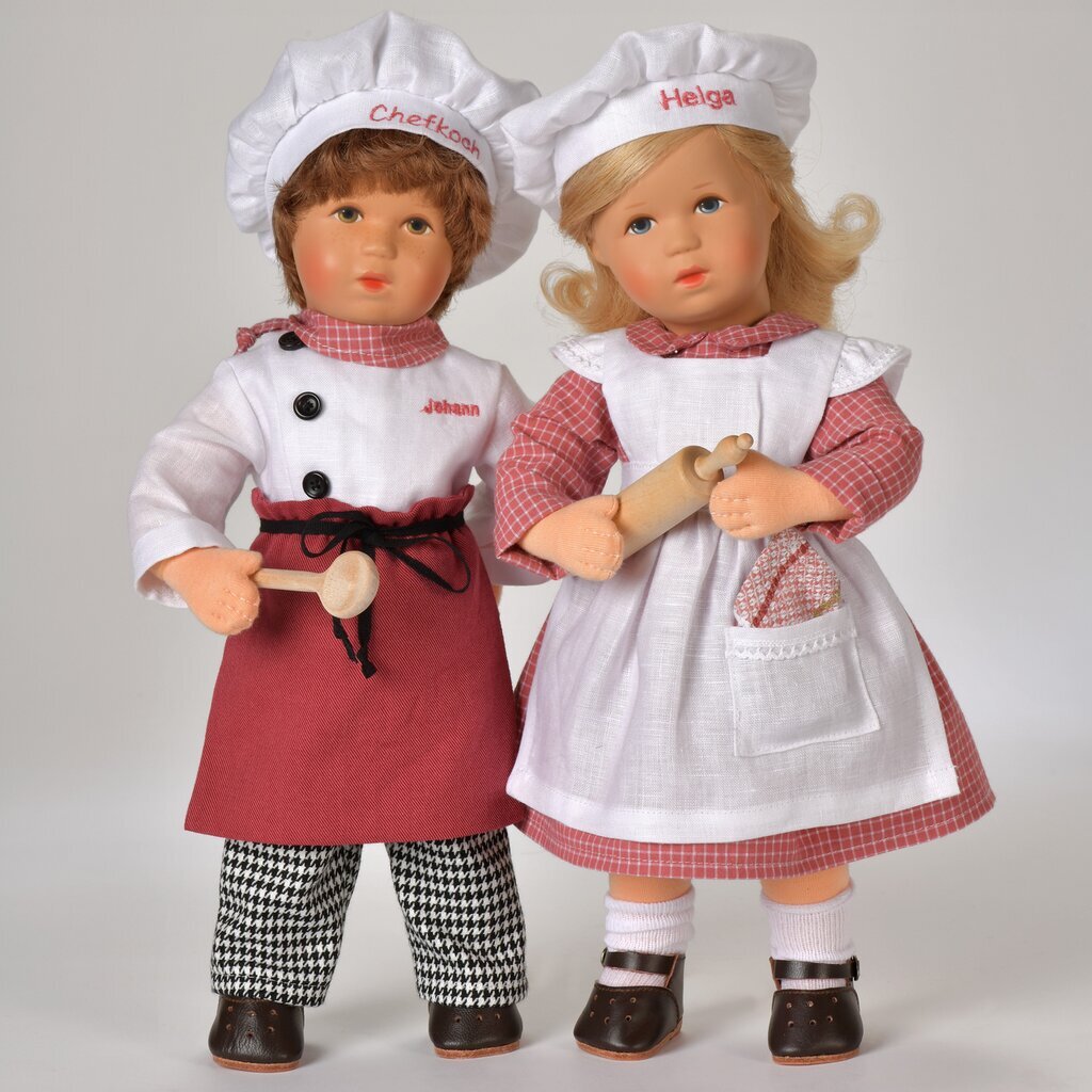 Unsere Sammlerpuppen und Bekleidung werden handgefertigtt und haben eine Lieferzeit von ca. 30 Werktagen. Unser Chefkoch ist eine 34 cm groß Schummelchen Puppe. Der Körper ist weich geschäumt und mit dem inneren Drahtskelett besonders vielseitig zu dekorieren. Der Polystyrolkopf ist ein handbemalter Rumpumpel Kopf. Unseren Chefkoch können Sie nach der Bestellung noch individualisieren und personalisieren. Dafür erhalten Sie nach der Bestellung eine Email von der Käthe Kruse Manufaktur. Bei der Echthaarperücke haben sie die Auswahl der Farben blond, braun und rot. Bei der Augenfarben können sie zwischen blau, braun und grün wählen. Außerdem besticken wir die Kochjacke gerne mit ihrem Wunschnamen. Der Chefkoch bringt einen Holzkochlöffel mit.