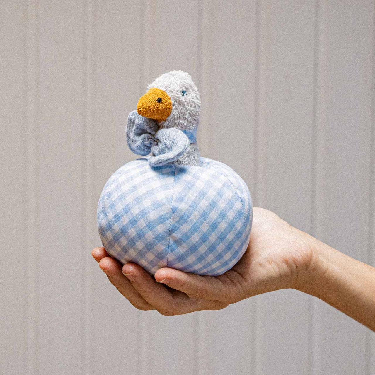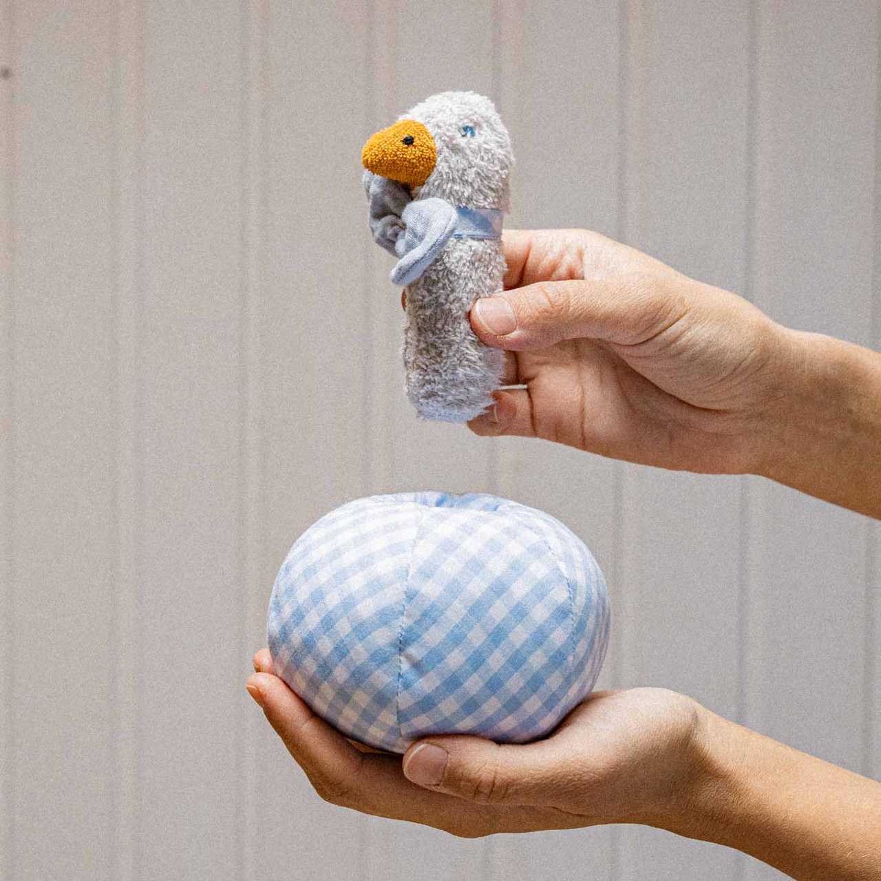 Wer hat Ebba gesehen? Die kleine Ente versteckt sich in einem weichen Ball aus karierter Baumwolle und dient als Greifling. Kleine Finger können sie aus dem Ball herausziehen oder wieder darin verschwinden lassen – perfekt für erste Steckspiele. Ebba ist aus Baumwollfrottee und verfügt über eine wunderschöne Musselinschleife, die das Zupacken durch kleine Hände erleichtert. Wird Ebba hochgenommen und bewegt, überrascht sie mit einem sanften Rasseln.