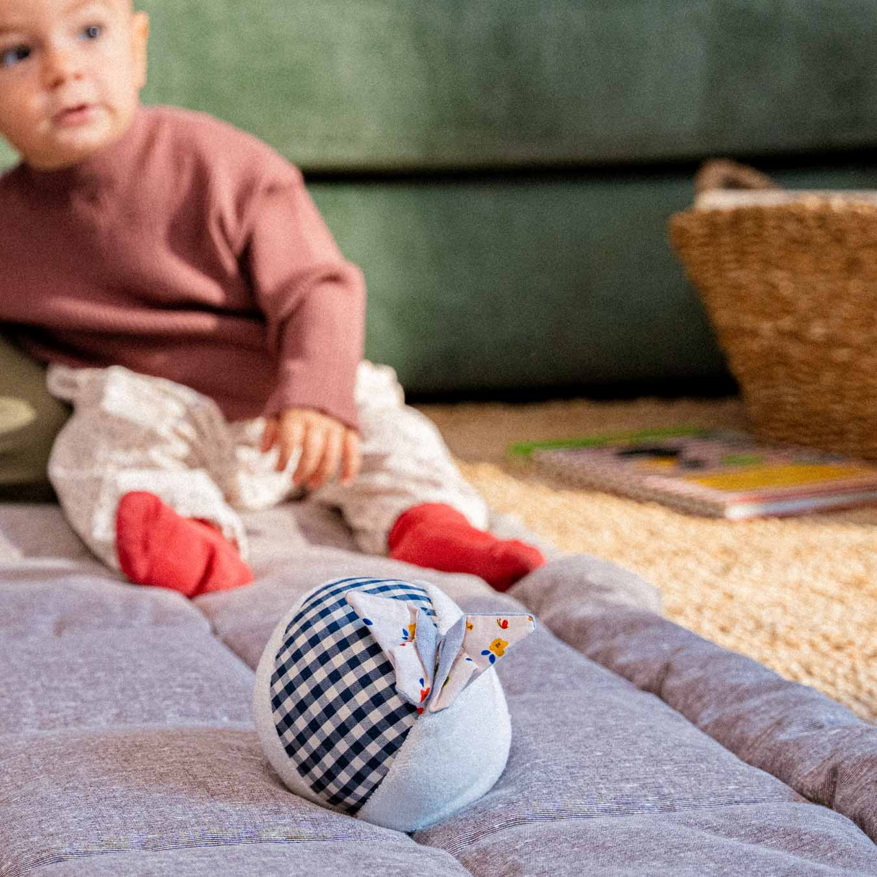 Lass uns Verstecken spielen! Auf dem leichten, mit Knisterfolie gefüllten, Aktivitätsball sitzt ein farbenfroher Origami-Falter, der sich kinderleicht im Inneren des Balls verstecken lässt. Der Plüschball selbst ist mit weicher Baumwolle bezogen und verfügt über ein Glöckchen im Inneren. Wenn der Falter eingeklappt ist, rollt der Ball kinderleicht. Er kann auch gut für erste Werf- und Fangspiele im Kinderzimmer genutzt werden.