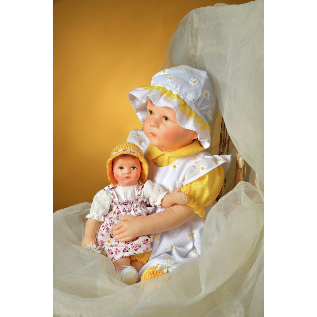 Mit Forentinchen feiern wir den 100. Geburstag des Puppentyps Du Mein. Dieser Puppentyp wurde von Käthe Kruse erstmals vor genau 100 Jahren gefertigt und mit Florentinchen haben wir eine verkleinerte Version dieses Puppentyps gefertigt. Florentinchen ist 27 cm groß. Der Puppenkörper ist mit Watte gestopft. Der Kopf aus Papiermaché ist eine verkleinerte Version des Du Mein Kopfes und liebevoll von Künstlerhand bemalt. Die Augen sind blau und das Haar ist in zarten Strähnen gemalt. Florentinchen trägt eine weiße Bluse und eine gelbe Pumphose mit Tupfenmuster und darüber ein geblümtes Hängerkleidchen. Rosa Strümpfe, weiße Schühchen und ein handgefertigter gelber Hut runden die Bekleidung ab. Unsere Sammlerpuppen und Bekleidungen werden handgefertigt und haben eine Lieferzeit von ca. 30 Werktagen.