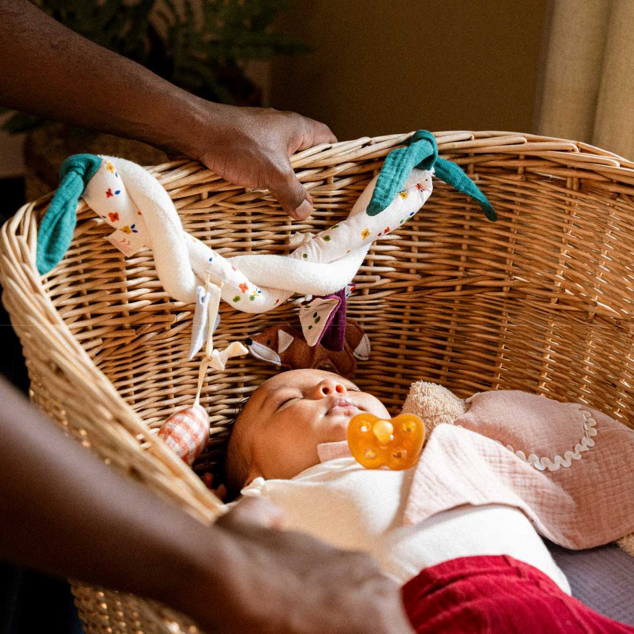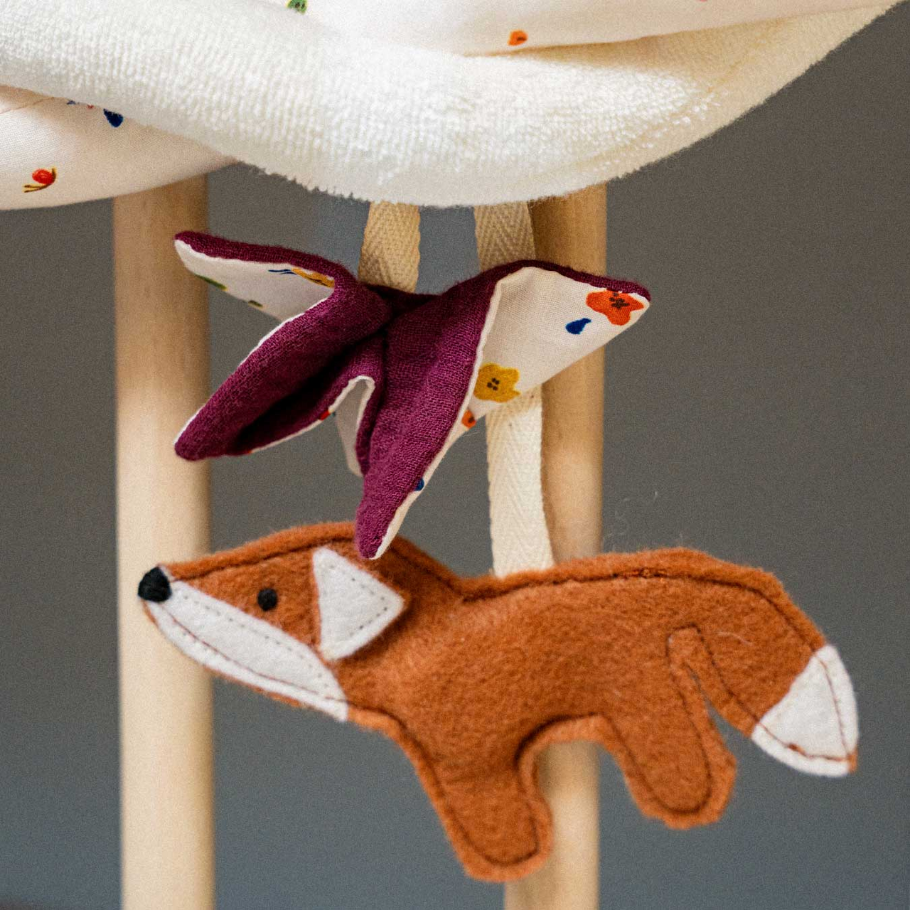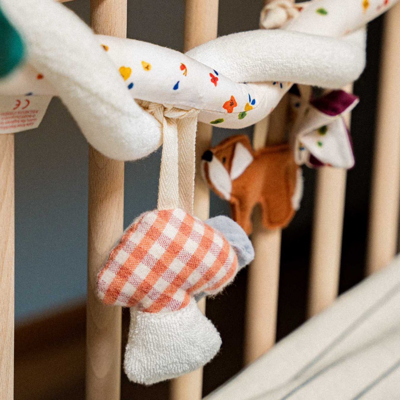 Alle an Board: An der gedrehten Kinderwagenkette haben es sich Flori Fuchs, Pilz, Schmetterling und Herz gemütlich gemacht. Sie kann ganz einfach an Trageschalen, Spielbögen und Co. geknotet werden. Auch über dem Bettchen sorgt sie für interessierte Blicke, denn die Kette gibt visuell viel zu entdecken. Knisterfolie und eine Glocke ermuntern außerdem zum Ertasten und Lauschen. Alle Anhänger baumeln lustig hin und her und können durch eine Schlaufe gezogen werden.