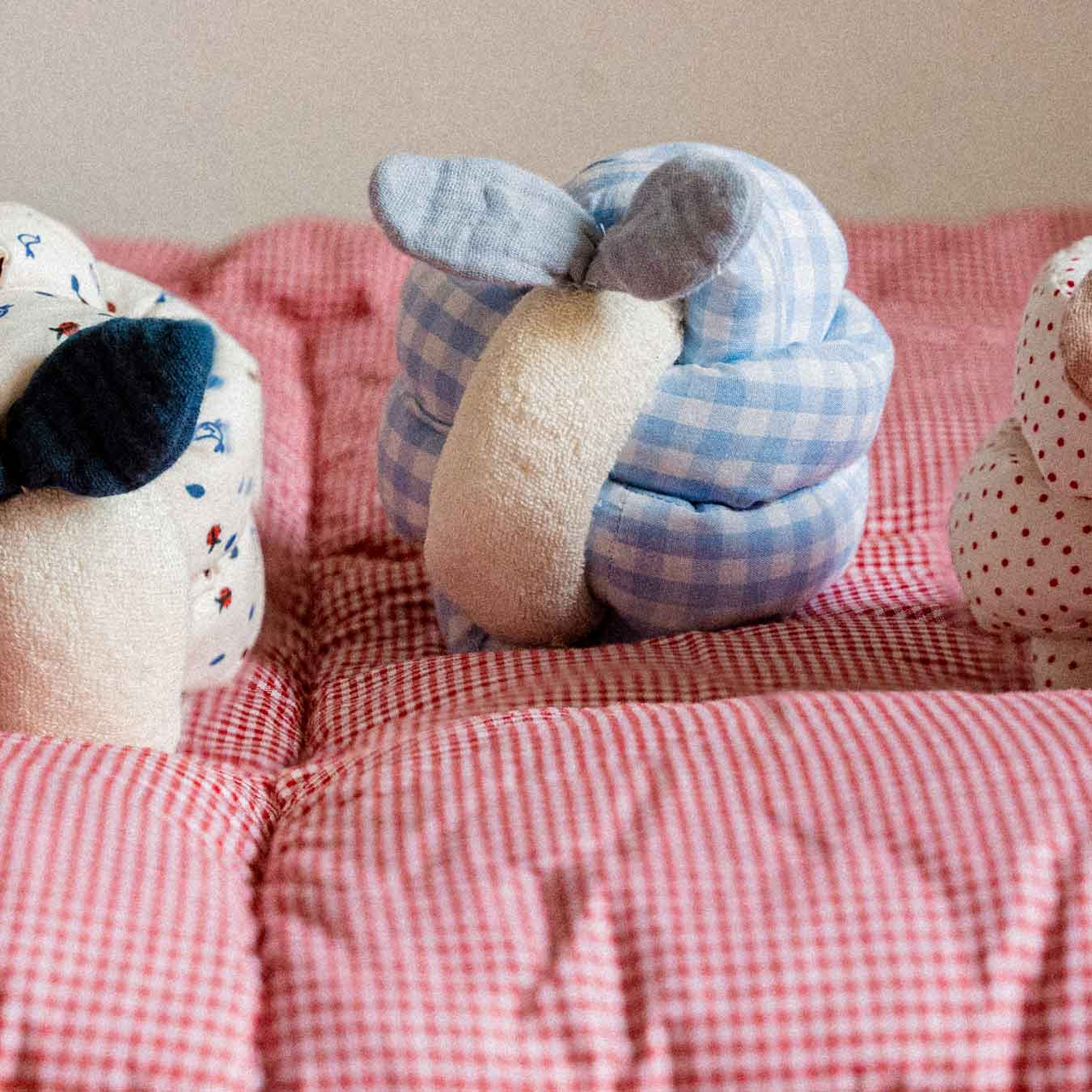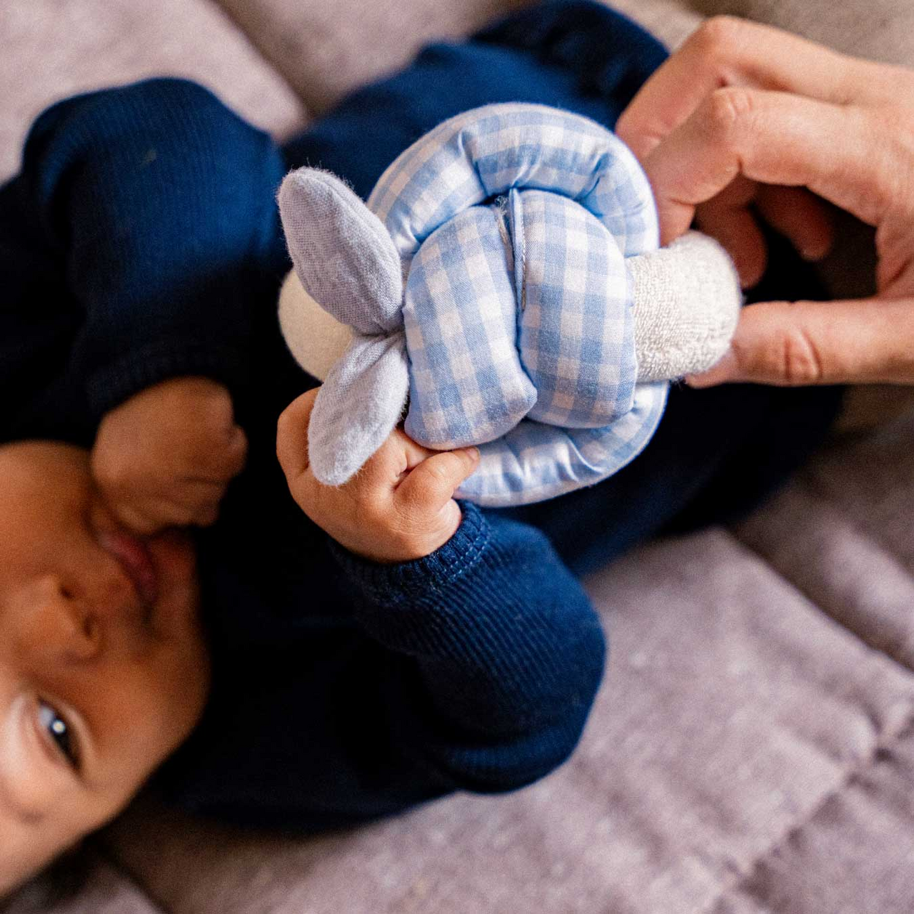 Komm, spiel mit mir! Der moderne Knotenball mit Glocke kann von kleinen Fingern gut gegriffen, gedreht und erkundet werden. Dabei ist er so leicht, dass er sich auch gut halten lässt. Durch den weichen Stoff kann er auch für erste Wurf- und Ballspiele verwendet werden. Mit seinem Design aus hellblauem Karostoff und einer Schleife aus Baumwollmusselin bringt er kleine Augen zum Leuchten. Gefertigt ist der Ball aus ineinander verknoteten Ringen aus weichem Strickfrotee.