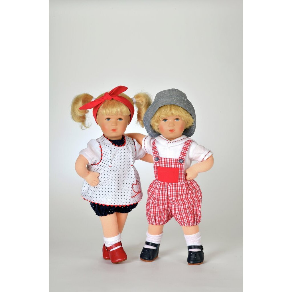 Lenchen ist eine 34 cm große Schummelchen Puppe. Der Körper ist weich geschäumt und mit Trikotstoff bezogen. Im Inneren des Körpers befindet sich ein Drahtskelett, das die Puppe beweglich macht. Der Puppenkopf ist der sogenannte Rumpumpel Kopf und ist aus Polysterol gefertigt. Das liebe Puppengesicht mit den strahlend blauen Augen ist künstlerisch von Hand gemalt. Die blonde Echthaarperücke trägt Lenchen zu seitlichen Pferdeschwänzen frisiert. Lenchen ist maritim bekleidet mit einem kurzen Spielanzug und einer gepunkteten und hübsch verzierten Überschürze. Weiße Strümpfe, rote Lederschuhe und ein rotes Haarband vervollständigen die Bekleidung. Unsere Sammlerpuppen und Bekleidungen werden handgefertigt und haben eine Lieferzeit von ca. 30 Werktagen.