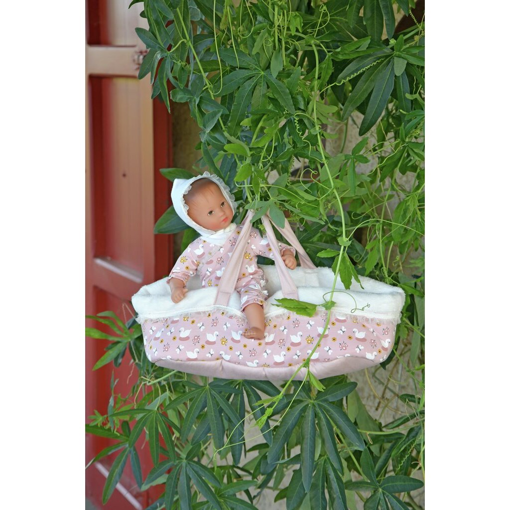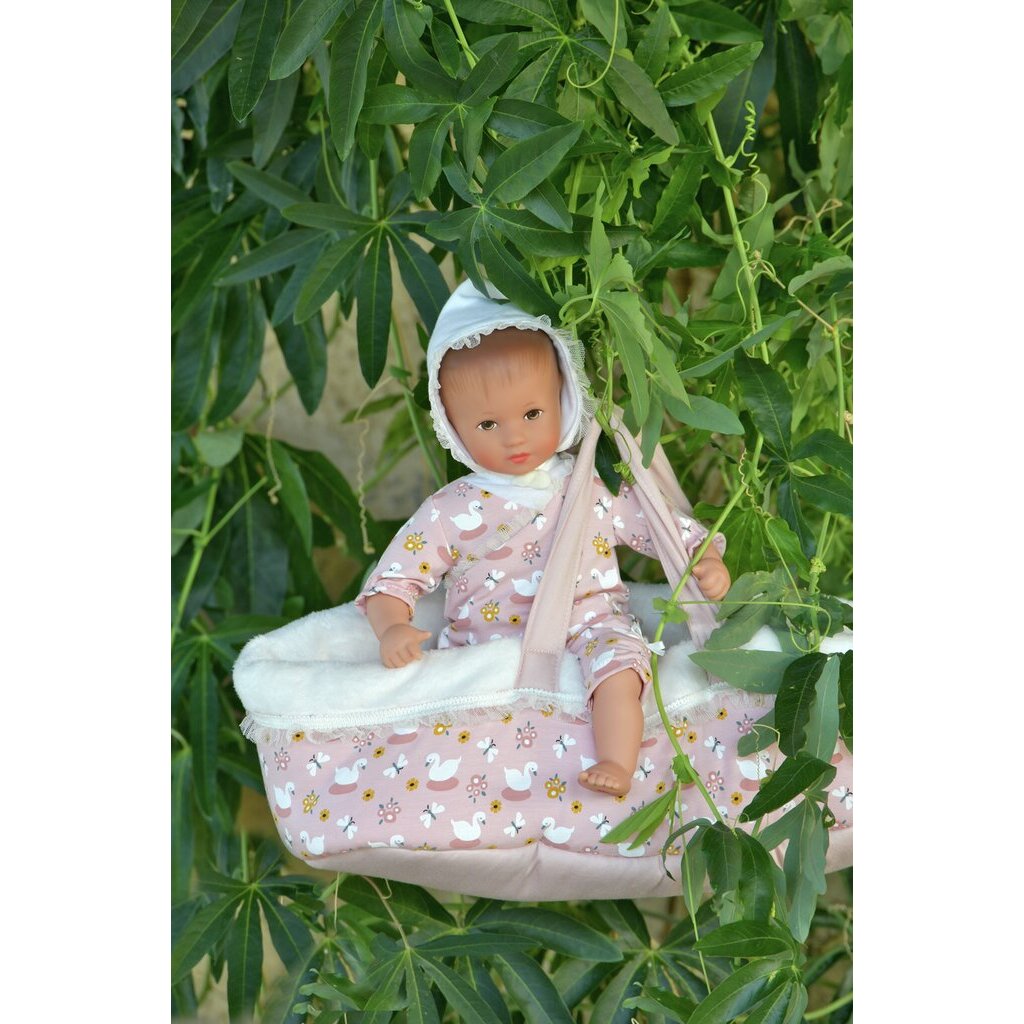Tiara ist eine Babypuppe und kommt in einer praktischen Tragetasche. Der Strampler im niedlichen Schwanendesign ist aus weichem Baumwoll Jersey genäht. Dazu passend trägt Tiara ein Mützchen.