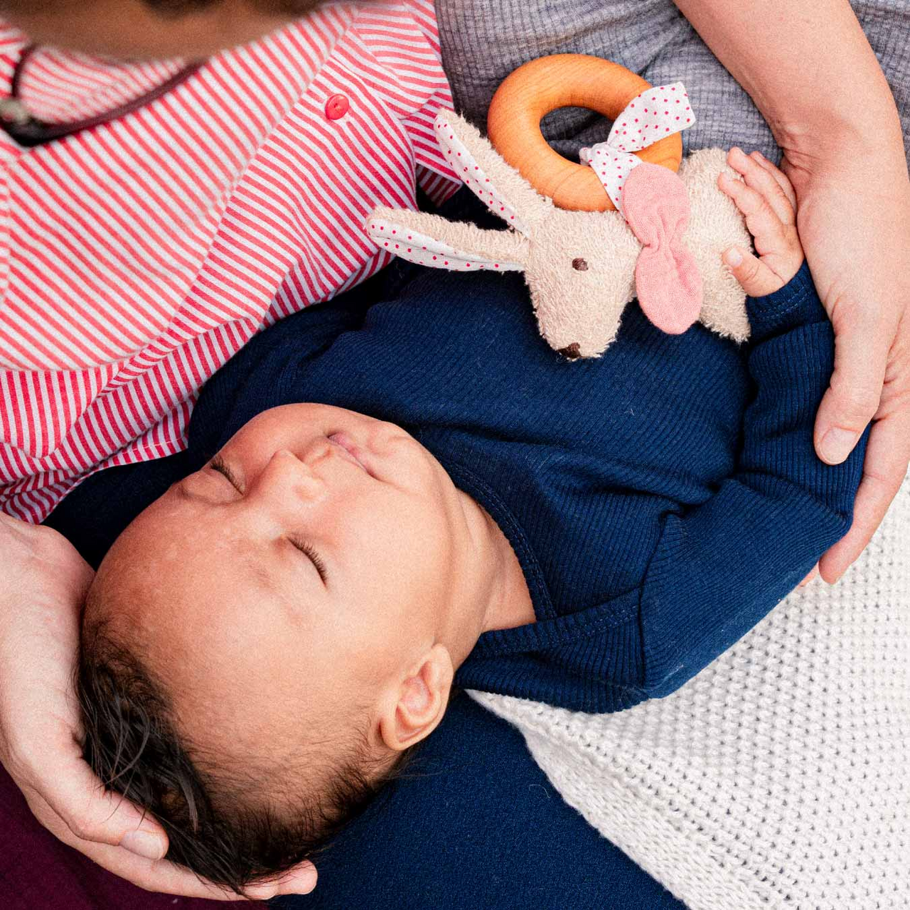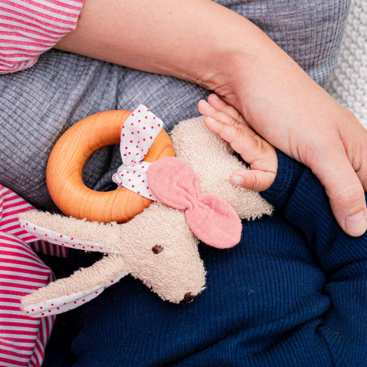 Komm, spiel mit mir! Das Häschen ist mit seinem gepunkteten Schleifen-Halsband an einem Greifling aus Kirschbaumholz befestigt. Zum Waschen oder zur Verwendung als Kuscheltier kann es losgebunden werden. Die Hasenohren sind genau auf das Halsband abgestimmt, um die Mustererkennung zu unterstützen. Ob im Kinderwagen oder im Bettchen – durch die kleine Rassel im Inneren ist das Häschen Kuscheltier und Spielzeug in einem.