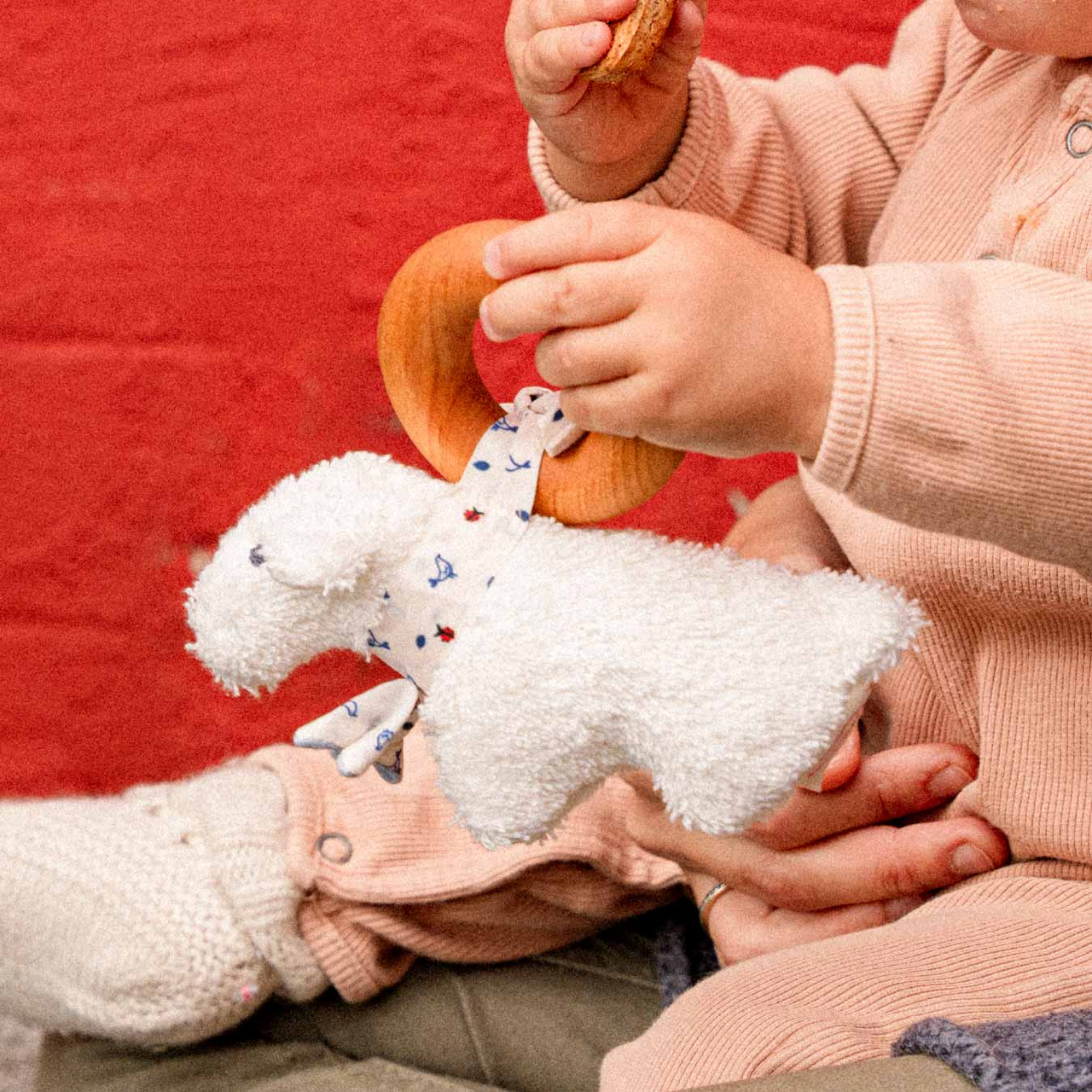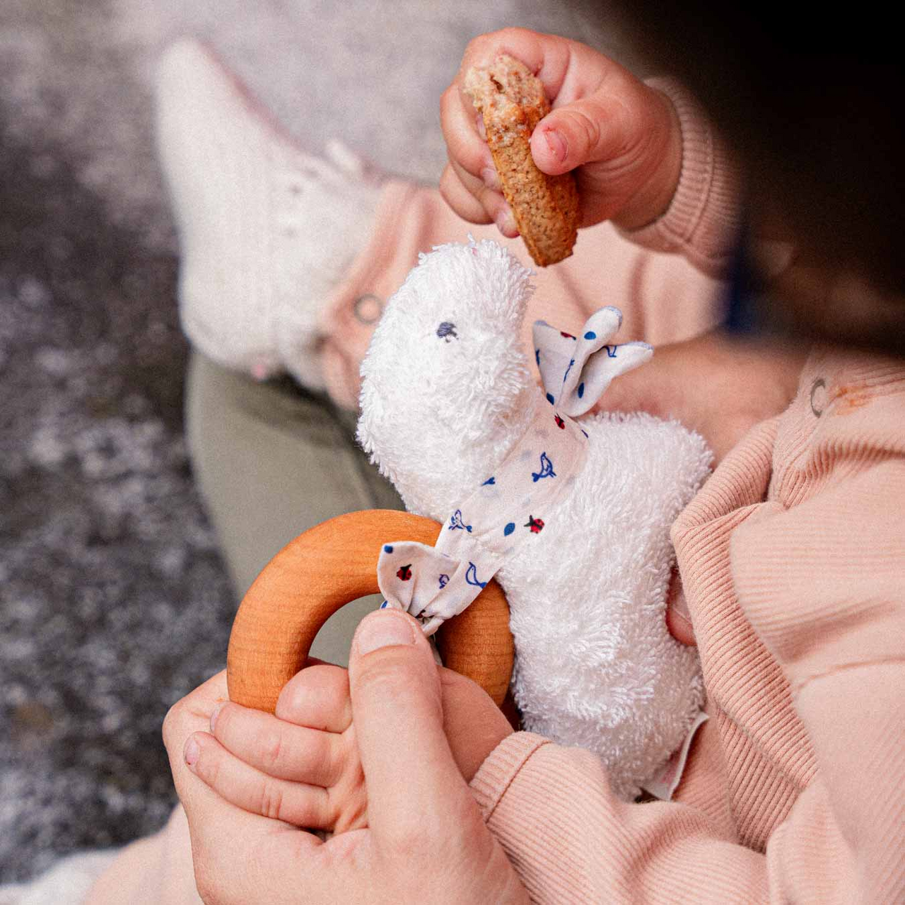 Komm, ich begleite dich: Das kleine Lämmchen ist Kuschelfreund und Rassel in einem. Es ist an einem Kirschbaumholzring fest geknotet, kann aber auch abgenommen und als Rassel bespielt werden. Schöner Blickfang: Das niedliche Bauernhof-Design des weichen Glockenhalsbands, welches das Lämmchen trägt und als Befestigung am Greifling dient. Das kleine Bauernhoftier ist ein echter Freund, das schon vom allerkleinsten Fingerchen betastet werden kann.
