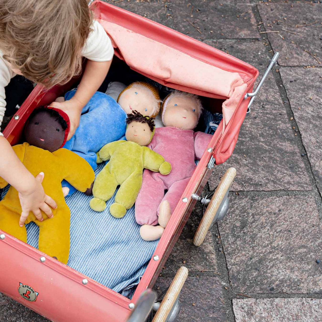 - Alle Waldorfpuppen sind aus natürlichen Materialien gefertigt und mit Wolle gefüllt. Wolle ist weich und warm, sollte daher von Hand mit einem Wollwaschmittel gewaschen werden und nie lang im Wasser liegengelassen werden. Die Puppen trocknen am besten an der frischen Luft auf dem Bauch liegend.