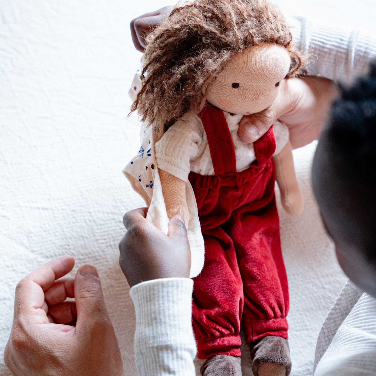 - Alle Waldorfpuppen sind aus natürlichen Materialien gefertigt und mit Wolle gefüllt. Wolle ist weich und warm, sollte daher von Hand mit einem Wollwaschmittel gewaschen werden und nie lang im Wasser liegengelassen werden. Die Puppen trocknen am besten an der frischen Luft auf dem Bauch liegend.
